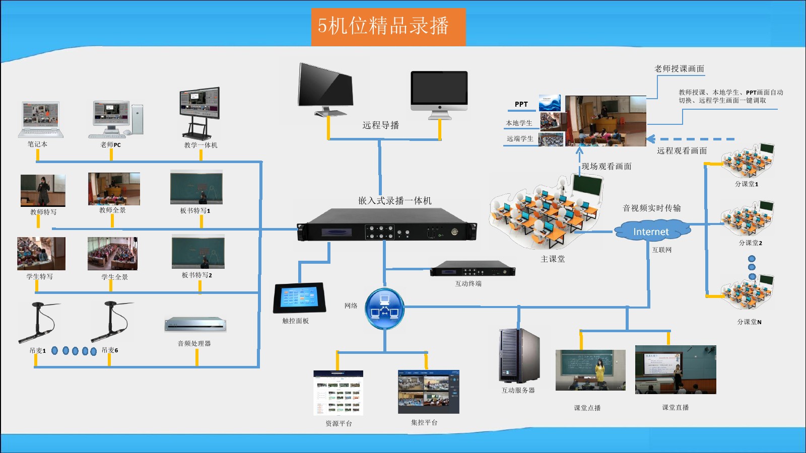 自主研發(fā)的錄播主機(jī),內(nèi)置互動(dòng)模塊,一臺(tái)錄播機(jī)即可完成課程錄制,互動(dòng)課堂的功能。實(shí)現(xiàn)不教室上同上一堂課的教學(xué)目的。
