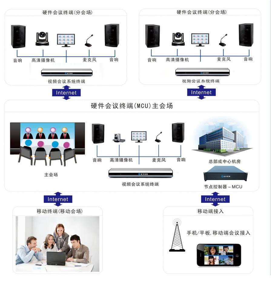 遠(yuǎn)程視頻會(huì)議系統(tǒng)是指兩個(gè)或兩個(gè)以上不同地方的個(gè)人或群體,通過傳輸線路及多媒體設(shè)備,將聲音、影像及文件資料互相傳送,達(dá)到即時(shí)且互動(dòng)的溝通,完成會(huì)議目的系統(tǒng)。與傳統(tǒng)電話會(huì)議相比,具有直觀性強(qiáng),信息量大等特點(diǎn)。視頻會(huì)議系統(tǒng)不僅可以聽到聲音,還可以看到會(huì)議參加者,共同面對商討問題,研究圖紙、實(shí)物,與真實(shí)的會(huì)議無異,使每一個(gè)與會(huì)者確有身臨其境之感