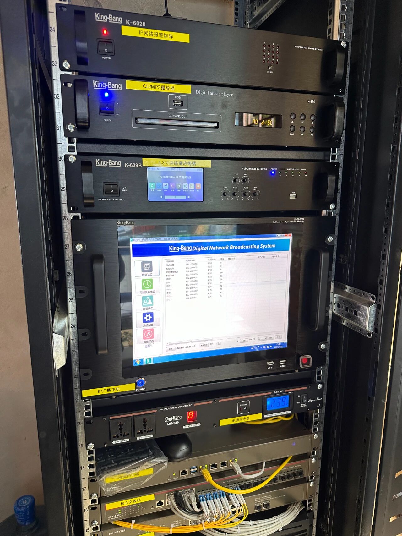 根據(jù)用戶需求,配置了15英寸IP網(wǎng)絡(luò)觸屏廣播服務(wù)器(支持多種音樂(lè)播放模式,如USB熱插播、硬盤(pán))、4.3英寸IP網(wǎng)絡(luò)機(jī)架編碼器(觸屏版)內(nèi)置自定義8個(gè)快捷按鍵,每個(gè)按鍵可定義中文名字為廣播喊話、雙向?qū)χv、及文件廣播等應(yīng)用,DVD/MP3播放器(微電腦控制,輕觸式按鍵操作),16路網(wǎng)絡(luò)報(bào)警矩陣(系統(tǒng)可支持多臺(tái)IP網(wǎng)絡(luò)消防采集器同時(shí)接入,用戶可根據(jù)自己的需求任意擴(kuò)展),8路20A多功能時(shí)序器(芯片控制,使電路更加穩(wěn)定可靠),大功率室外防水音柱揚(yáng)聲器等廣播設(shè)備(適用于大型廣場(chǎng)、操場(chǎng)、公園、體育館、高速公路、高鐵、地鐵等場(chǎng)所進(jìn)行遠(yuǎn)程擴(kuò)音,可用來(lái)應(yīng)急廣播和播放背景音樂(lè))。讓整套系統(tǒng)使用效果更佳,使用更加方便。